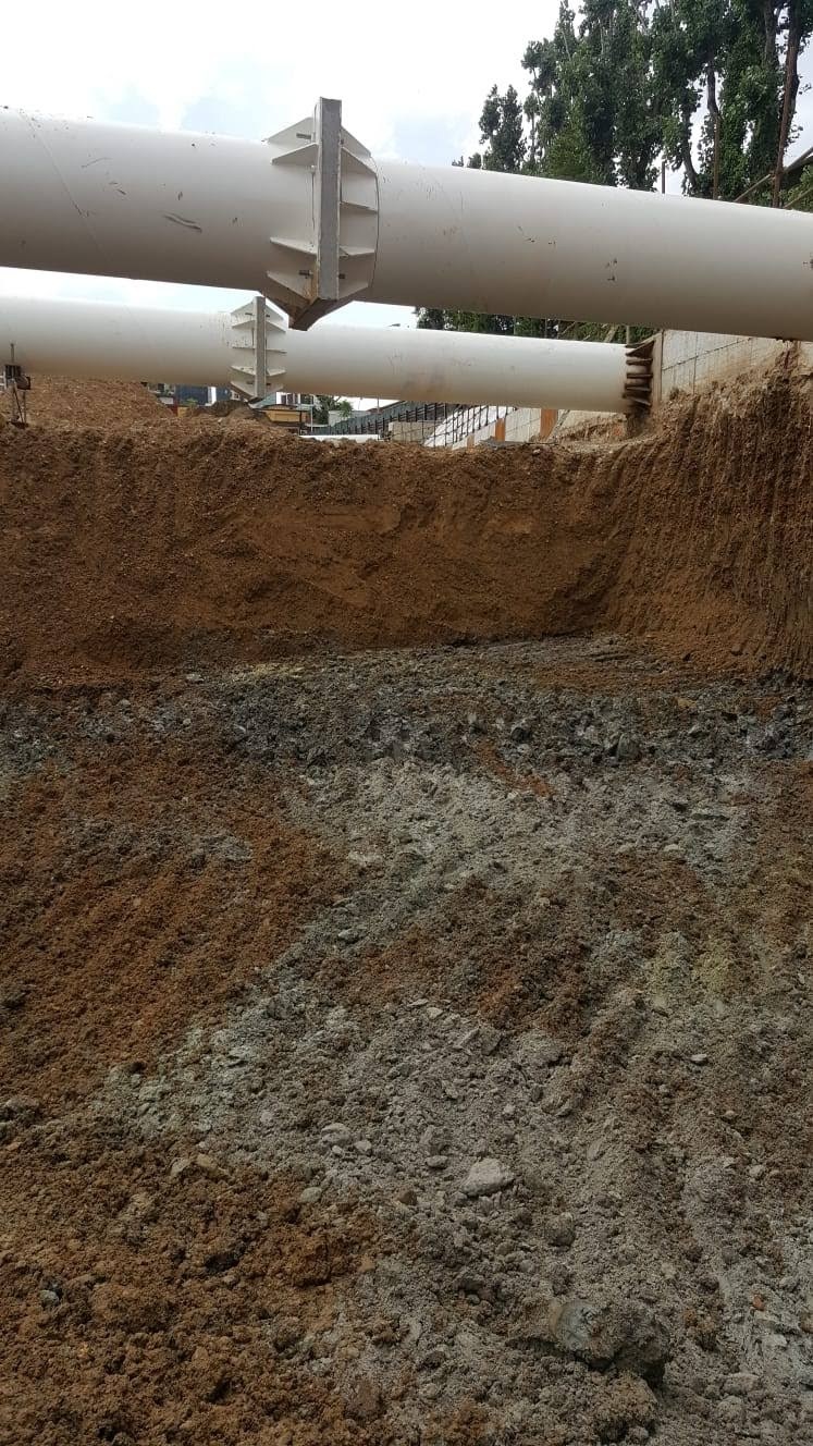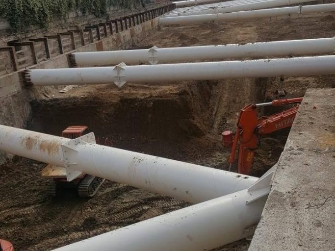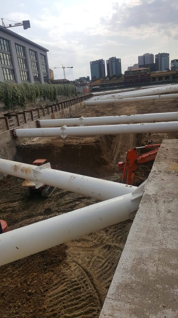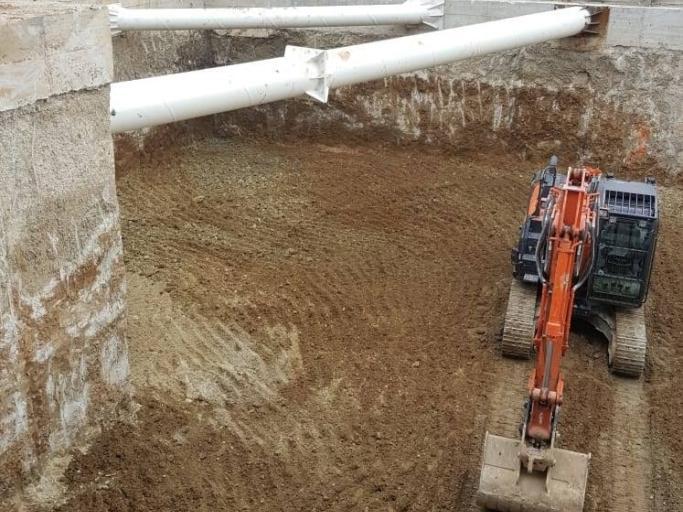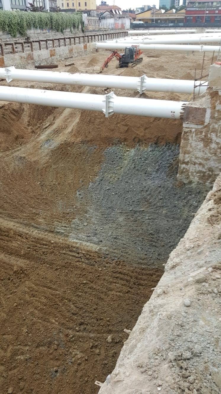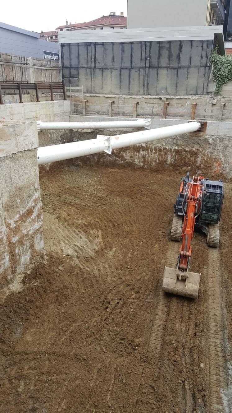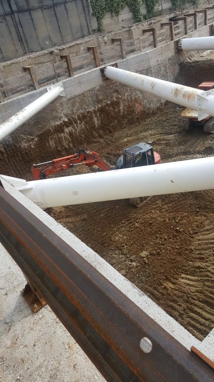 Puntoni di contrasto delle paratie di contenimento, nessuna possibilità di scendere con i mezzi di trasporto a fondo scavo ed una area di cantiere a piano strada minimale con un unico punto di carico.